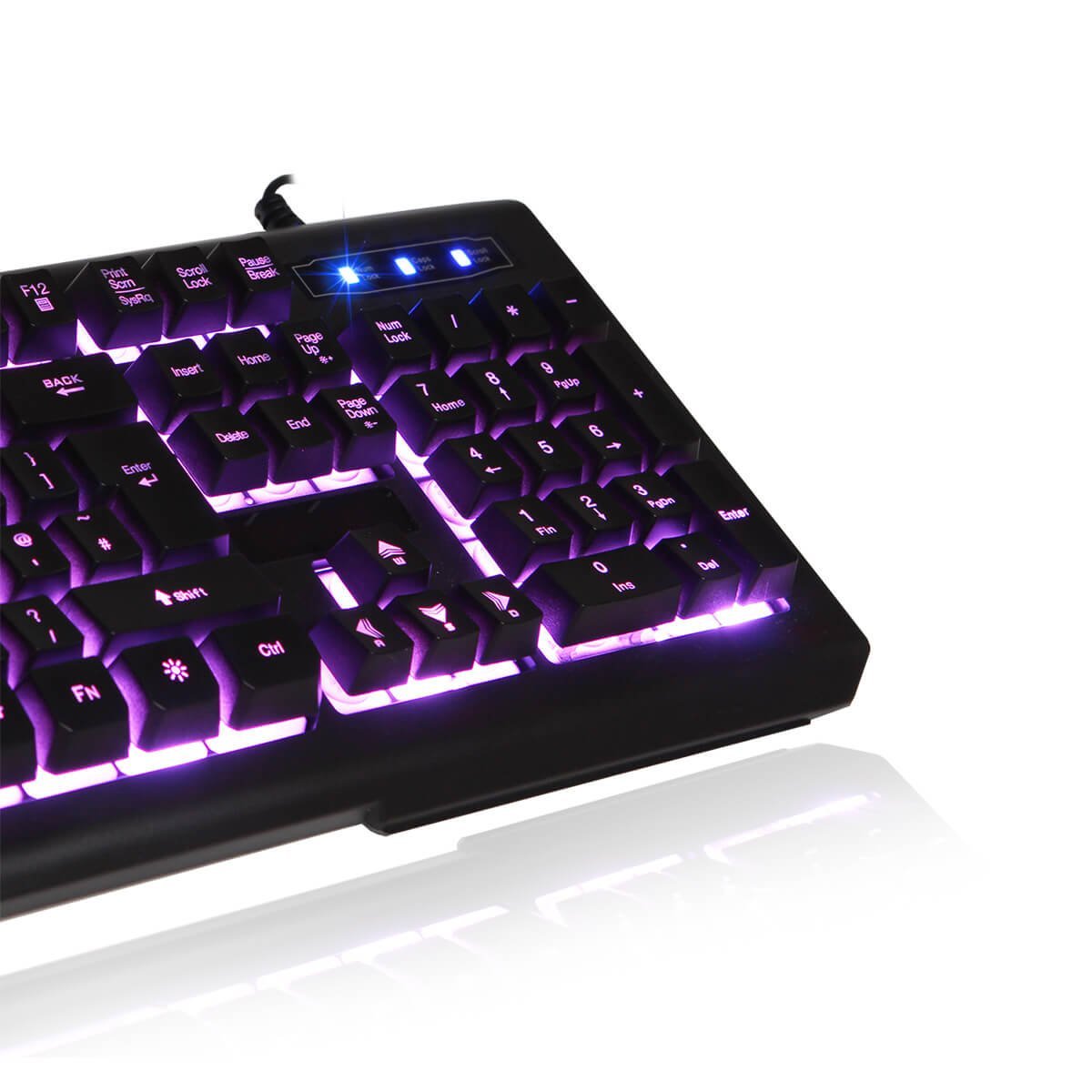 - Backlighting: Choose from three LED backlight colorsβRed, Blue, and Purple. The color and lighting mode can be adjusted, and the brightness is customizable.